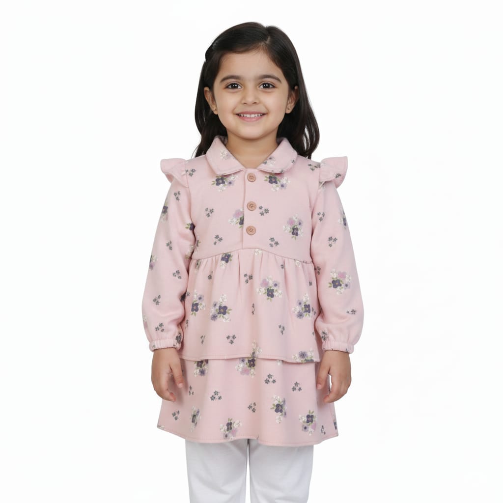 This Fancy Frock in peach features a cozy winter fleece fabric designed to keep your child warm during colder months. Adorned with enchanting all-over flower prints, it combines comfort with playful charm. Ideal for everyday wear, the soft fleece ensures warmth without compromising on style.