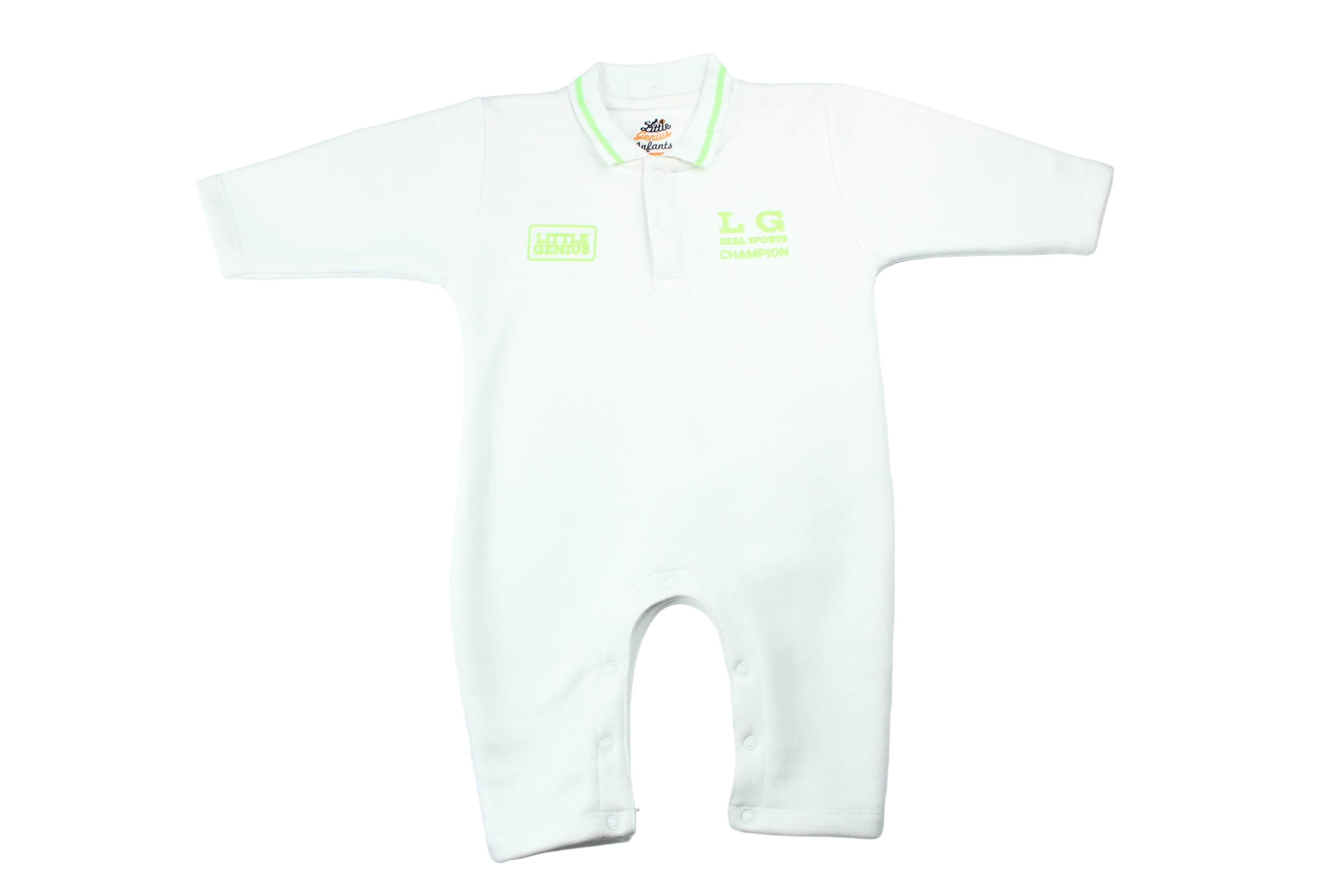 A soft and comfy full-sleeve romper featuring a stylish polo collar and front button detail. Designed with easy snap closures for quick changing, perfect for everyday comfort and sporty style.